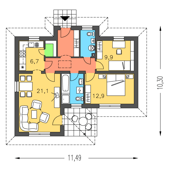 HP 72 je vhodný do nízké zástavby • svými vnitřními prostorami uspokojí nároky na bydlení tří až čtyřčlenné rodiny • je řešen bezbariérově • neobytné podkroví, které lze využít jako další skladový prostor domu • vhodný pro rovinatý, případně mírně svažitý terén • možnost výstavby i na menších stavebních parcelách
